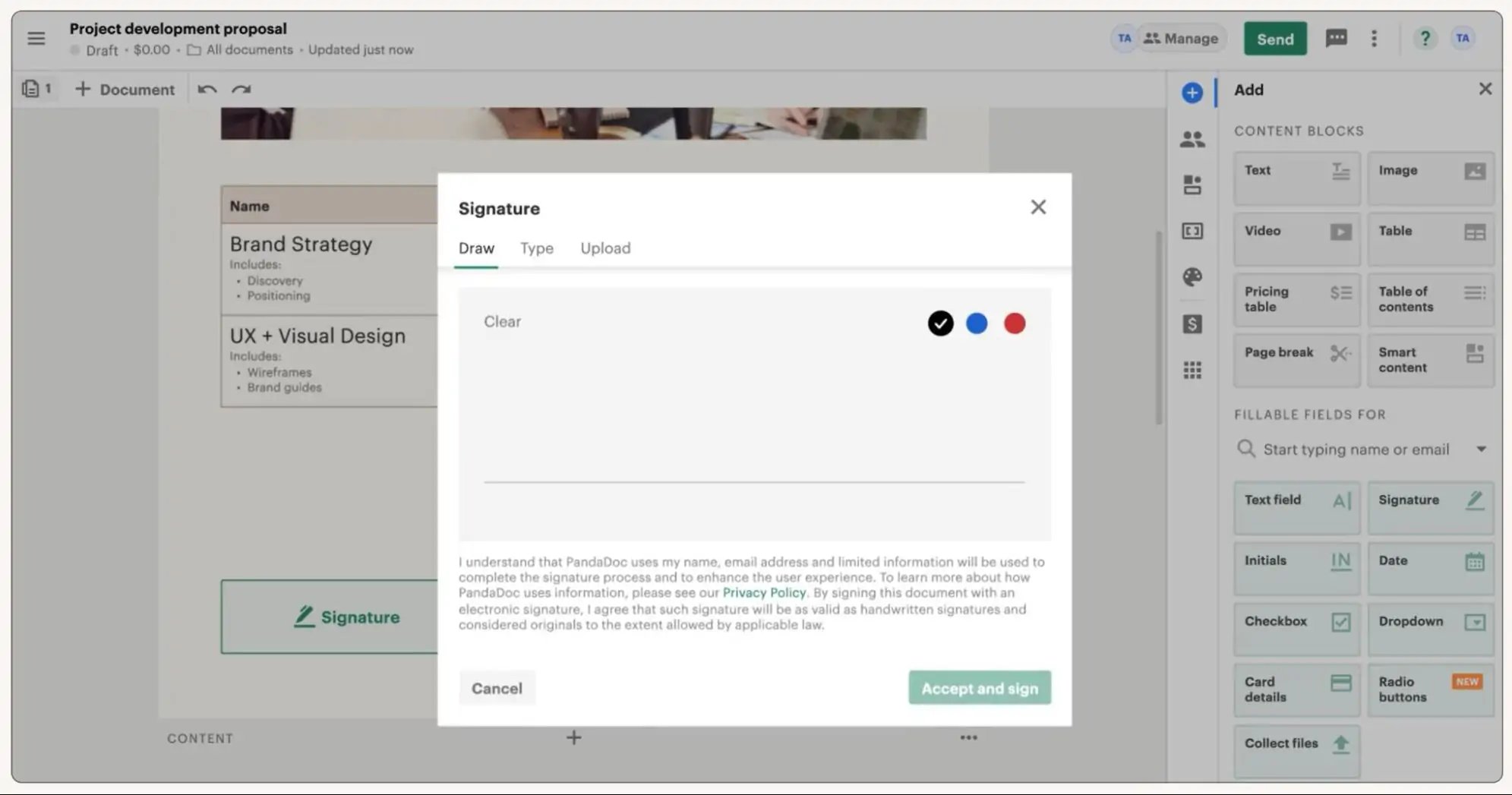 PandaDoc offers a content management solution with an easy-to-use, content block-based user interface. Create proposals and contracts in minutes, and clients sign them remotely with the built-in electronic signature feature.