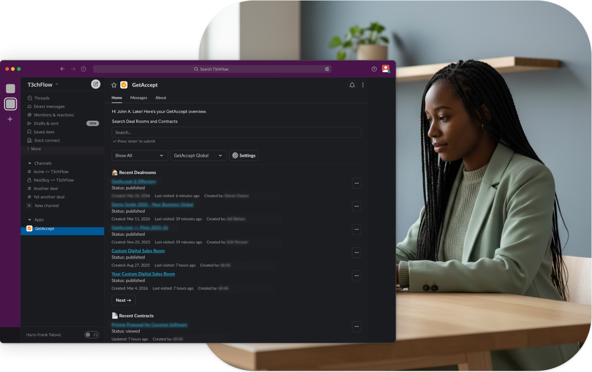 With GetAccept + Slack, the signals that matter show up in the channels your team already follows. That means fewer check-ins, less tab switching, and faster reactions when a buyer engages.