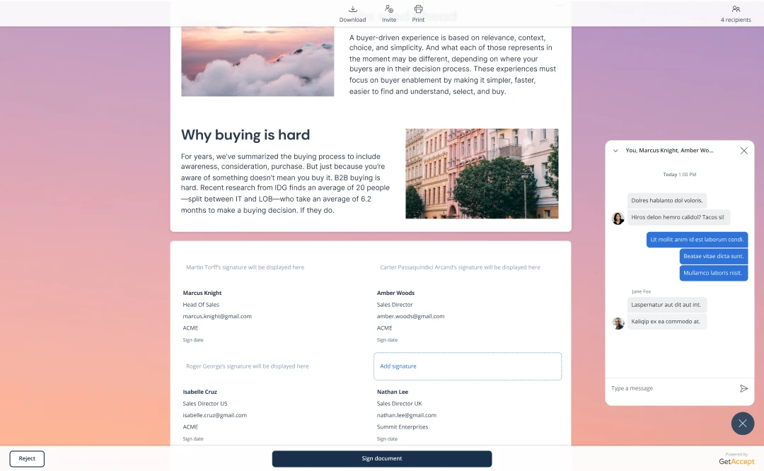 Find out how GetAccept will have you creating, sending, and gathering eSignatures on beautiful documents in a flash.